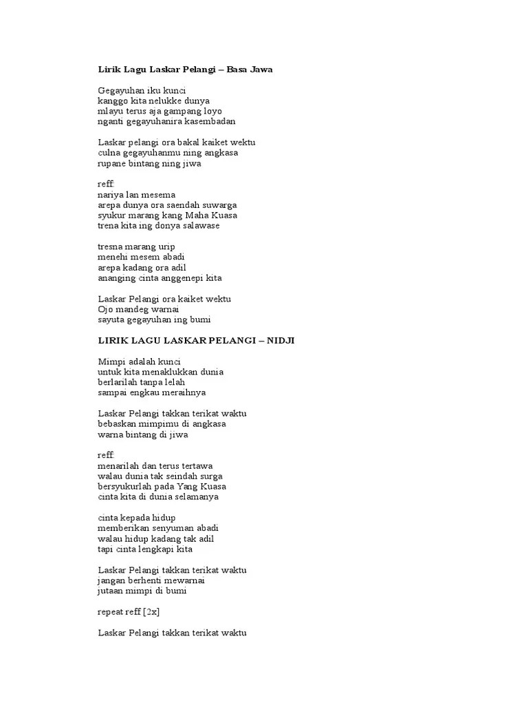 Berikut ini adalah chord gitar dan lirik lagu laskar pelangi dari nidji. intro a d a d a d mimpi adalah kunci c#m d e . Coba cari di website ini? Berikut chord gitar dan lirik lagu laskar pelangi dari grub band nidji : 1st fretintro c f c f verse cmimpi adaflah kunci Chord gitar nidji laskar pelangi sumber : Kalo belum ada, silahkan daftar untuk menulis . Request chord services , organizes chords collection. Penempatan kunci gitar nidji laskar pelangi di bawah, saya taruh persis di atas lirik pada waktu perpindahan chordnya. C f c f c f mimpi adalah kunci c f untuk kita menaklukan dunia em. Udah pernah cari lirik dan chord gitarnya ga? Lagu laskar pelangi karya cipta giring ganesha yang masuk dalam jajaran kompilasi lagu tema atau soundtrack untuk film adaptasi novel karya.